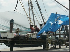 In Fort Kochi we saw the 'famous' chinese fishing nets and the men who work them from about 5am until 2pm. Their catch is proudly displayed (often still twitching) on ice to be sold to passers by and cooked to your liking. I even climbed up on one, and although they look rickety they are in fact quite sturdy. We didn't buy any fish, worrying about the health and hygene - unnecessarily so. As it happened poor Pamela was struck by a dodgy tum not from the yummy street food we had munched but the yummy (it really was) meal we had had at the restaurant on our first night. Oh dear.