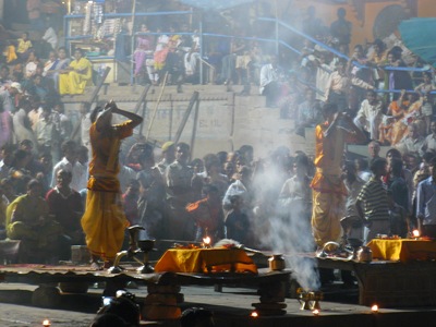 My first boat ride was taken at dusk, which gave us (me and my fellow tourists) the opportunity to watch the nightly ceremony at the main Ghat, from the river. That Thursday night, it just happened to coincide with Durga puja, when the mother goddess Durga is honoured by chucking effigies of her into the river, dancing about a bit, and setting off tons of firework. Both things were going on at the same time, at the same place. Truly a bonkers spectacle, but it made for some great photos.